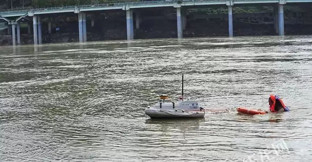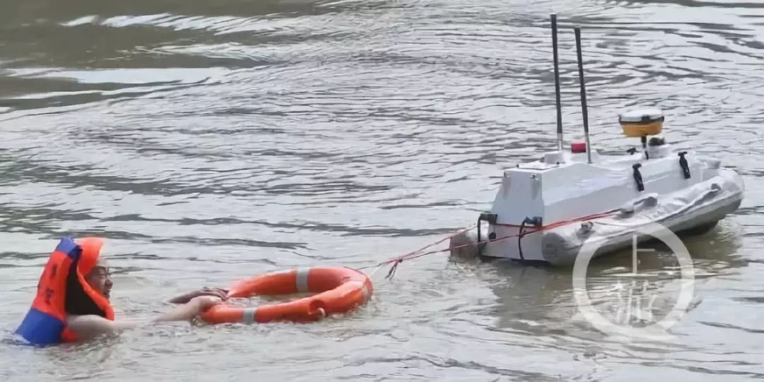 现场:无人船拖带救生圈 湍急水流中快速救人