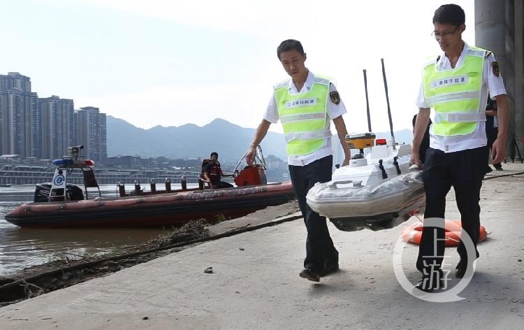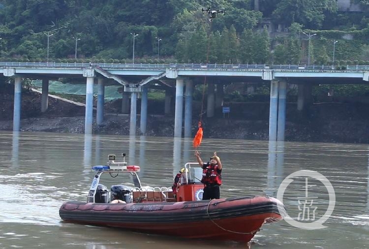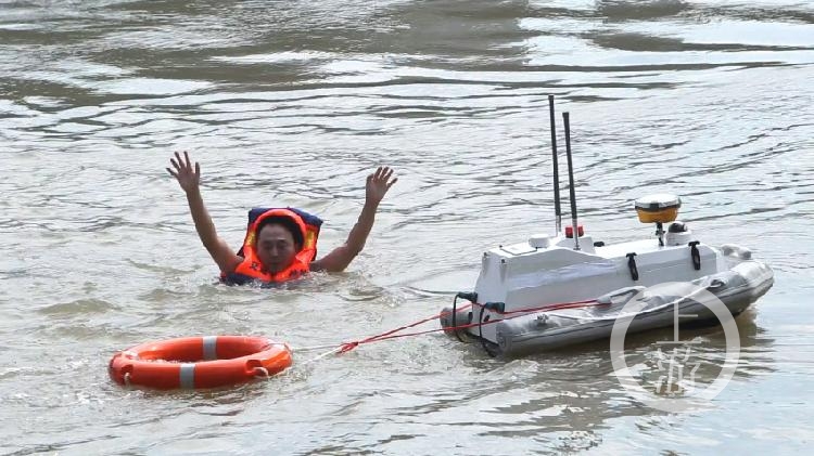 无人船技术研发主要应用于水环境监测、巡逻警戒、应急救援、地理测绘、水文、地貌、海洋调查、安防、核安全、抗洪抢险等领域 。图为重庆市地方水上应急救援中心展示无人机抛投救生衣。