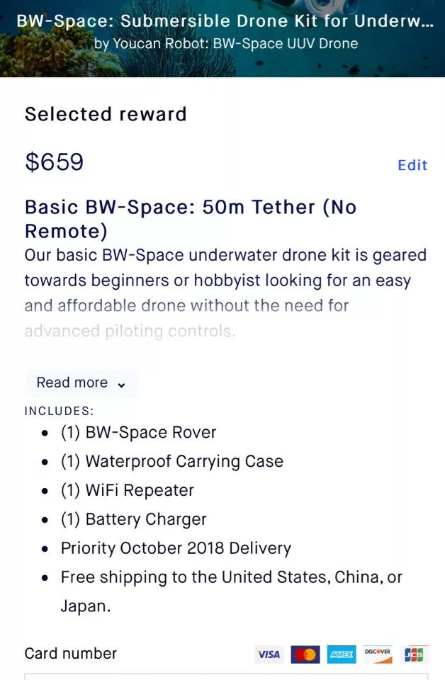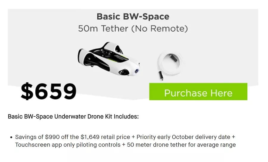 4折优惠,鼎力巨献约肯机器人在本次众筹活动中旨在开拓海外市场,逐步提高海外知名度,以及让更多真正对水下无人机感兴趣的用户以实惠的价格获得更好的体验,此次BW Space将在众筹平台Kickstarter上以市场价的40%最低优惠价上线。约肯为满足不同客户需求,设置了不同的配件套餐,不含手柄的套装最低只需659美金(全球限量200套),带有手柄低配版的也只需879元,与同类产品动辄上万的价格来说,性价比是相当高的。