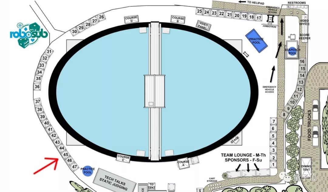 整个赛场的平面图,就是这个样子。左下角的箭头处,第45号位置就是哈工程战队所属的帐篷。