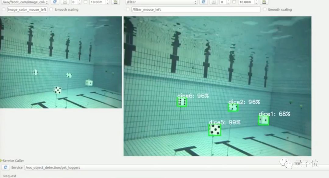 到达任务区域后,机器人需要从水底两个托盘里,分别抓取红色和绿色的筹码。然后前往指定区域,把手中的筹码,放到对应颜色的漏斗里。