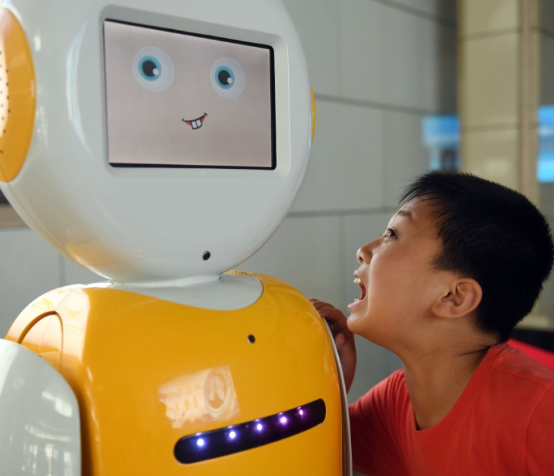 一名小朋友和沈阳新松机器人自动化股份有限公司生产的“松果”服务机器人对话(2017年5月20日摄)。
