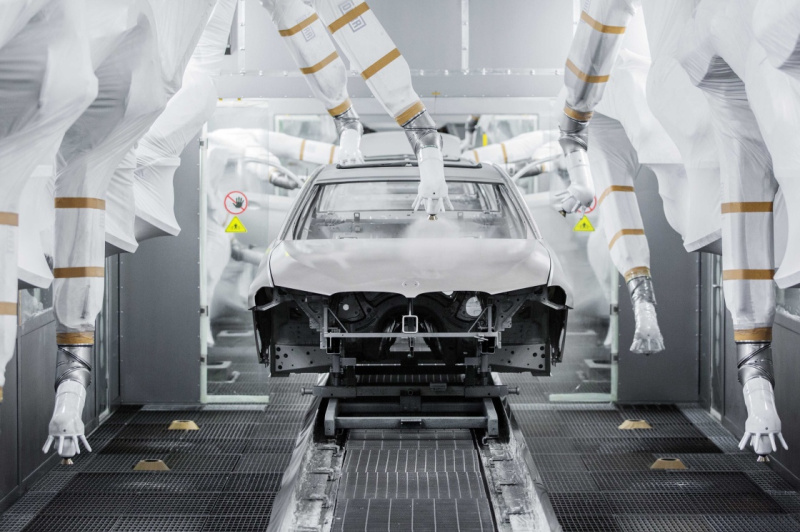 在沈阳华晨宝马汽车有限公司大东工厂涂装车间,涂装机器人为车身进行喷涂。