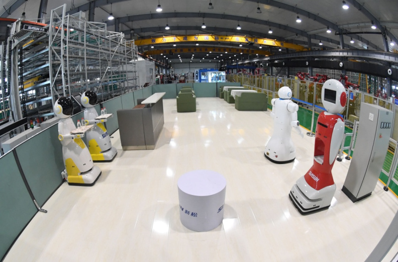 这是在沈阳新松机器人自动化股份有限公司生产车间内拍摄的服务机器人(2017年6月6日摄)。