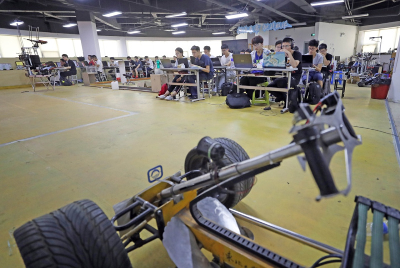 东北大学机器人ACTION团队的同学们进行亚太地区大学生机器人大赛的赛前准备(8月9日摄)。
