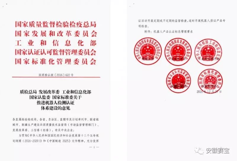2016年12月30日五部委联合发布《质检总局、发展改革委、工业和信息化部、国家认监委、国家标准委关于推进机器人检测认证体系建设意见》(国质检认联[2016]622号),进一步推进中国机器人检测认证体系。