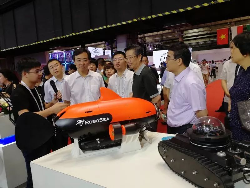 北京众领导在ROBO-SHARK前面驻足了很久,详细了解了该款水下机器人的各项功能和具体应用领域。
