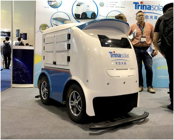 天合光能展出的自主研发的智能无人物流车具有自主导航、音视频通讯、环境感知、多层避障、后台管理及自主充电等功能。智能无人物流车可自定义快递柜尺寸及规格,适应各种不同需求。天合光能以提供整车或车辆服务的方式,探索无人车在不同行业及场景下的应用。