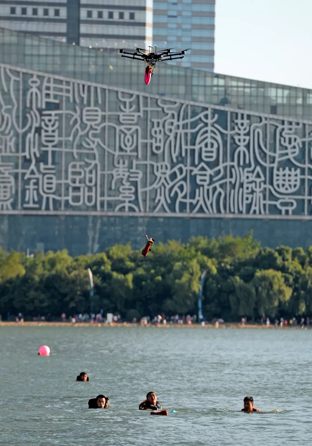 当天17时许,两船在湖面上“相撞”,一声“救命”在天鹅湖水面上响起,6人“落”入水中。很快,合肥市公安局水上分局的两架大型无人机迅速抵达出事水域上空,向“落水者”空投了救生衣和救生圈;然后,两个水面救援机器人迅速下水,来到出事水域,将其中两名“落水者”拖移到岸边;最后,水上公安的冲锋舟抵达现场,将剩余的落水者救上岸。原来,这是一场应急救援演练,合肥市公安局水上分局和合肥市应急救援队共同演示了使用高科技设备抢救“落水者”的过程。