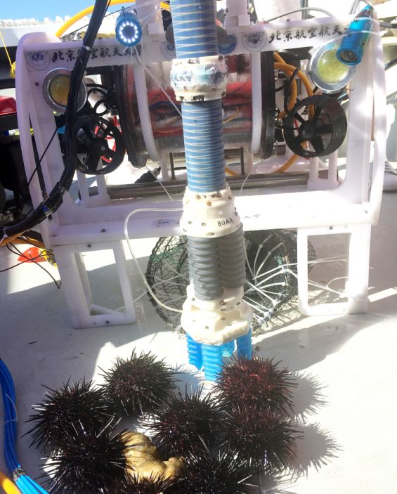 决赛首日率先采捕到海参的是北航自动化所联队,该队在去年的决赛中取得了较好成绩。领队文力教授表示,他们的想法就是研究的机器人能够快速用在像獐子岛这样真实海洋环境以及与产业相结合,更好的检验水下机器人的有效性。根据去年的比赛经验,实施了新的设计,主要是改进了机器人柔性采臂,改进了机器人在水下的运动速度、效率和劲度以及扩大了运动和搜寻范围,更好地实现与抓取筐的默契配合。