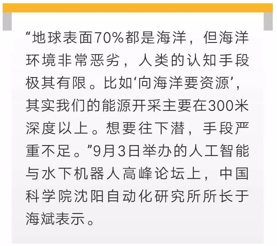 水下机器人是探索海洋的重要装备,在海洋观测、勘探、水下极端环境作业中潜能巨大。尤其是深海打捞、海沟科学研究样品取样等工作,非它不可。据于海斌介绍,上世纪60年代开始,载人潜水器、有缆遥控水下机器人、自主水下机器人研究相继开始,目前已经进入智能水下机器人时代。