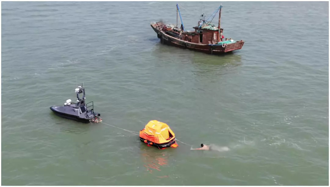 云洲M75“守护者”号安防无人艇弹出救生筏救起落水“走私犯”。