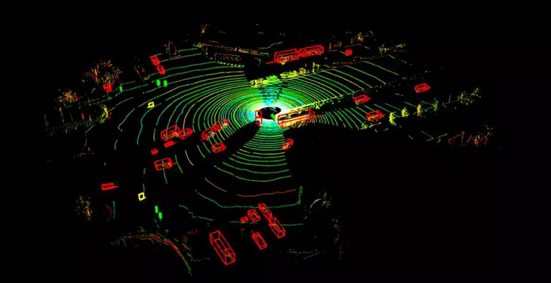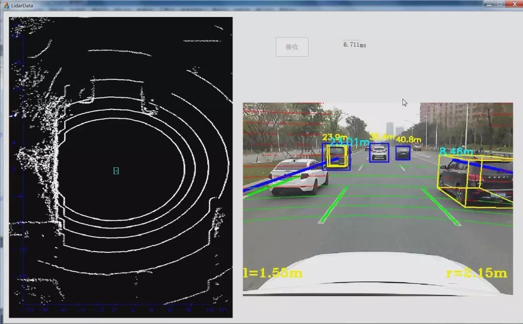 上图是将16线激光雷达与摄像头联合标定后将激光雷达点云映射到图像中的效果,两者融合可获得障碍物的深度信息,通过对点云特征和视觉颜色特征分别做算法处理,可提高检测识别的精准度,并最终在图像中显示出车辆的三维轮廓和距离、车辆与车道线的间距、道路边沿等驾驶辅助信息。