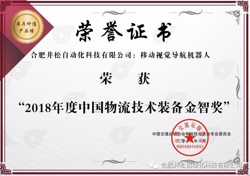 经组委会前期遴选,井松“移动视觉导航机器人”产品已入围中国物流技术装备 “ 金智奖”名单。近日,合肥井松自动化科技有限公司受邀出席了2018中国智能物流技术装备大会暨物流技术装备企业家年会,并在会议现场举行的颁奖晚宴中荣获“中国智能物流技术装备金智奖”,并领取证书。