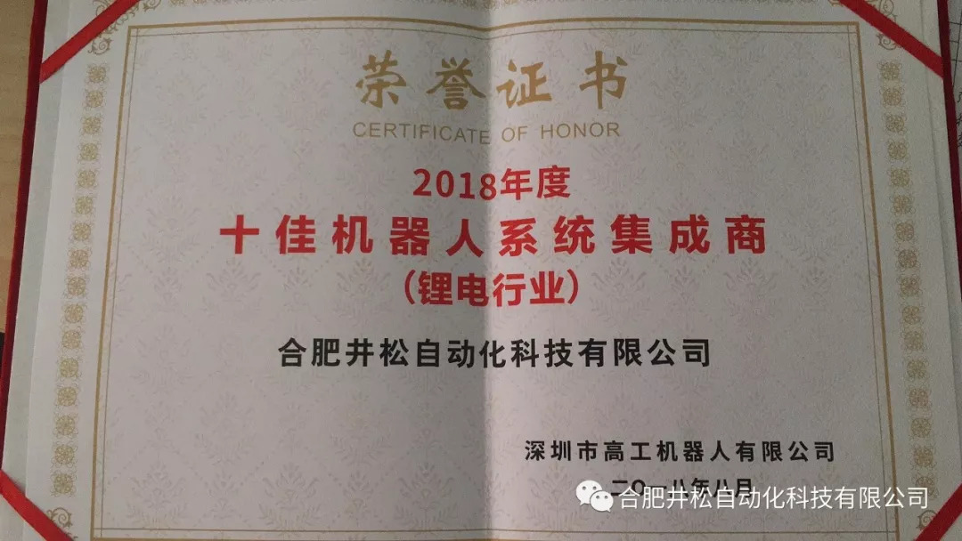 在高工机器人面向机器人行业征集的“十佳机器人系统集成案例”活动中,井松携“国轩高科自动化生产及仓储线”参与锂电行业的评选,并荣获“十佳机器人系统集成商”证书。