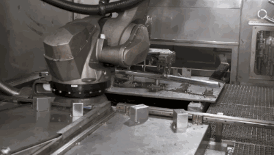 第一道工序中,KR QUANTEC nano F exclusive 使用特制的多重夹具从进料口抓取工件。