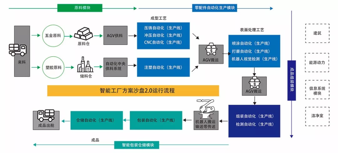 整厂解决方案——智能制造综合服务模块,介绍通用行业智能工厂流程规划方案;智能工厂实施过程及原理教学应用;介绍新厂规划的建设过程;适用于各阶段制造企业升级改造的方案展示,全人力、半自动化、新建厂、产线改良等;包含注塑、打磨、冲压、CNC、包装、装配、检测、搬运等近十几种自动化解决方案。