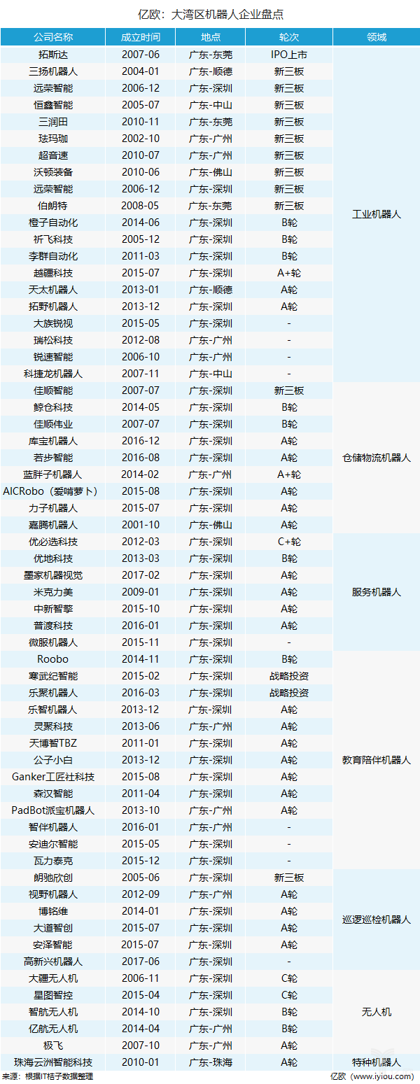 为了更加深入的了解粤港澳大湾区的机器人产业发展,亿欧搜集和整理了61家在落户粤港澳大湾区的A轮以上机器人企业,希望从中梳理出大湾区机器人产业的未来发展方向。