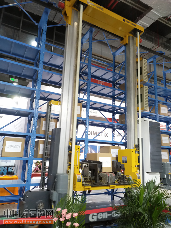 此次展示的双立柱堆垛机,最高可达30米,载重500KG,速度达240-260米/分,核心零部件多为井松科技自主研发,其中货叉便是井松科技的技术积累,自主研发生产。