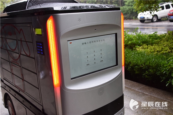 10月9日,在长沙经开区德普·企业公元,一辆看似缩小版的“巴士”缓缓地在路上走着,不久,“巴士”停下,输入取货验证码,侧面的快递箱随即弹开……没错,这就是长沙经开区内的长沙行深智能科技有限公司(以下简称长沙行深智能)为京东研发的无人配送机器人“超影800C”。