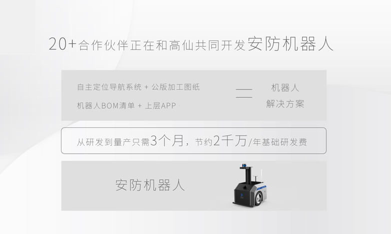 目前,高仙正与20+合作伙伴共同开发安防机器人,作为拥有底层技术的上游企业,高仙将为合作伙伴提供自主定位导航系统、完整的机器人BOM清单、公版加工图纸、上层APP等应用部件与系统。高仙安防机器人解决方案能够为合作伙伴打通机器人产业供应链,并节省机器人前期的基础研发投入,通过双方携手,共同探索智能安防新硬件的应用方向。