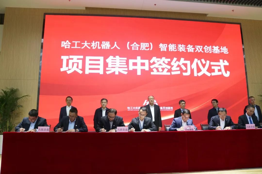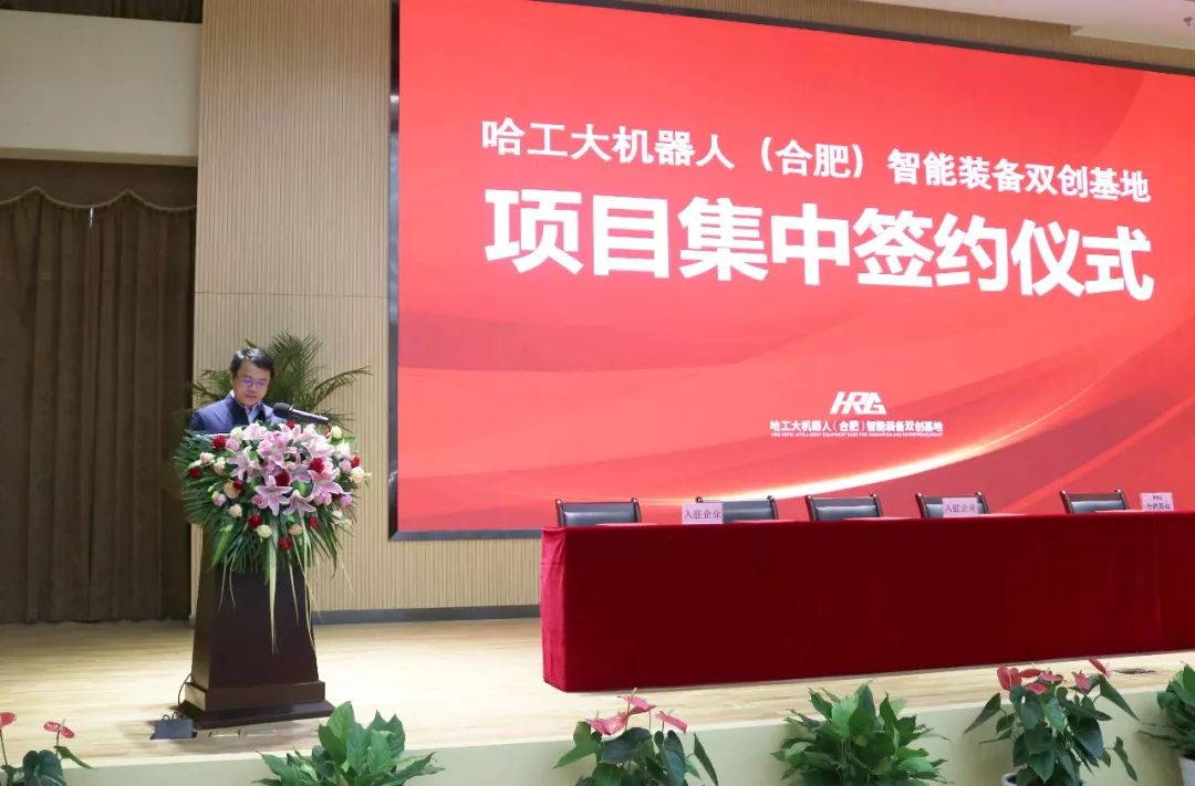 10月15日下午,哈工大机器人(合肥)智能装备双创基地(以下简称“合肥基地”)项目集中签约仪式在合肥市经开区智能装备科技园举行。市委常委、经开区工委书记、管委会主任杨伟,哈工大副校长、中国科学院院士韩杰才出席仪式并见证签约。哈工大机器人集团董事长王飞,合肥经开区管委会副主任孙余洲分别致辞。哈工大机器人集团高级副总裁、合肥基地负责人于振中代表基地与现场24家企业代表进行签约。