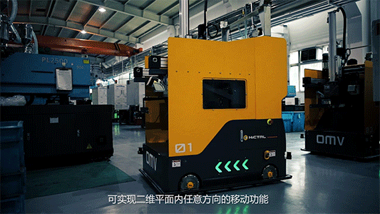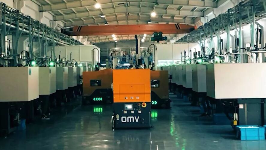 ①从注塑机物料出口的装料框至缓存区采用OMV设备进行无人自动化的转运;