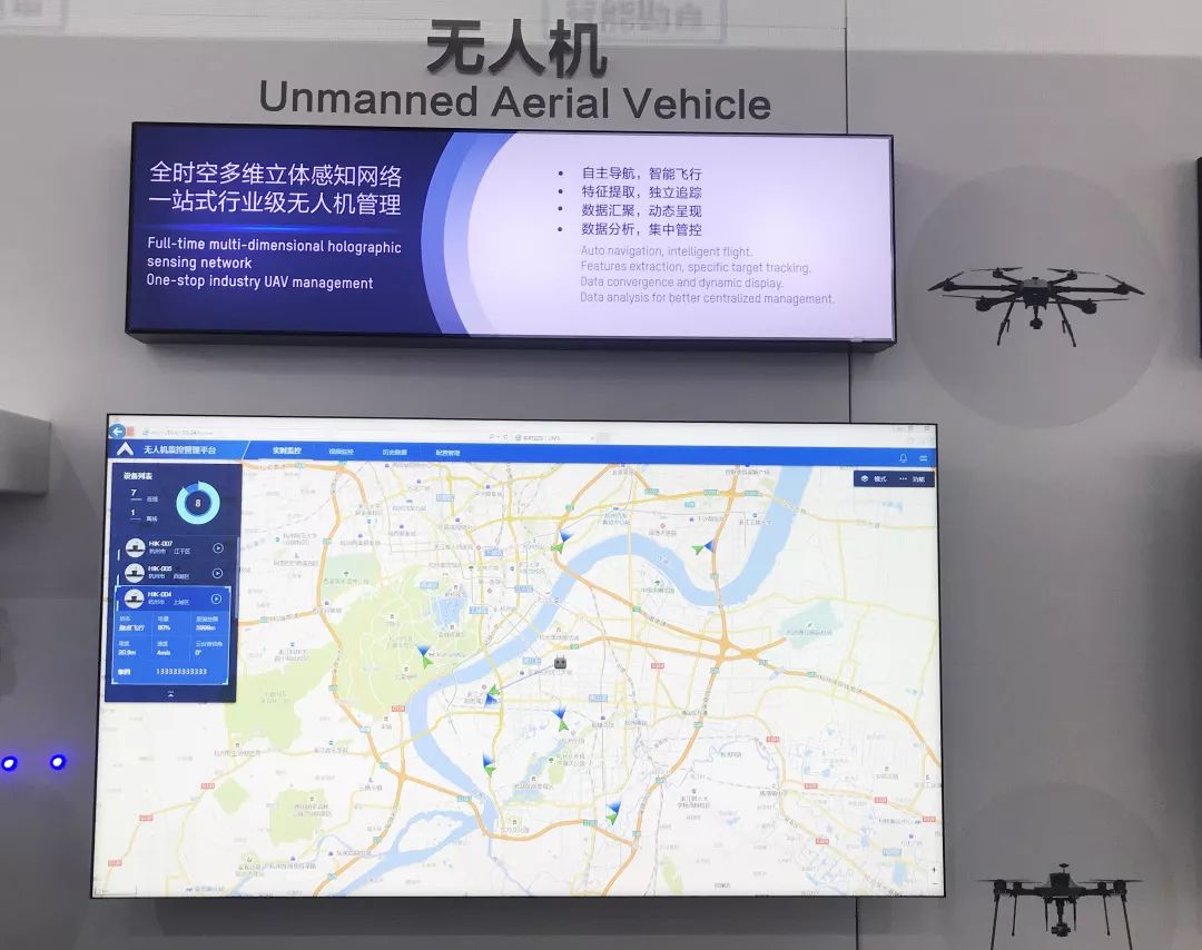 另一侧,无人机监控管理平台与悬挂于墙面的飞行器以代表数据流的灯带相连——飞行数据、视频数据实时传输,业务、数据整合互通,仿佛就在眼前。