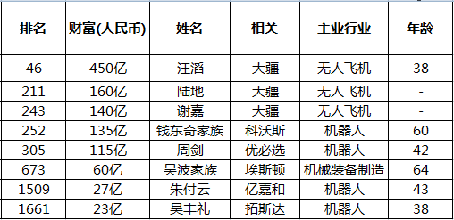 以上是2018年胡润百富榜中以机器人为主营业务(或以机器人为主营业务)的企业家排行榜,其中霸居机器人领域富豪榜单前三的均为大疆人,分别是大疆CEO汪涛、陆地、谢嘉,其中大疆CEO汪涛以450亿身家登机器人首座,在总榜中位列46,与2017年的第55位相比,上升了9位,紧随其后的两位陆地和谢嘉排名均有所上升,总榜中分别排第211位和第243位。