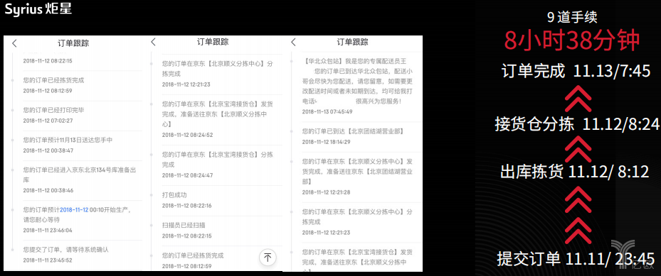 “11月11日,在电商狂欢节最后十几分钟时,我通过京东商城下单购买商品。下单7小时后,定单打印成功,又过了1小时22分钟,商品打包完成,送上卡车从仓库运走。从消费者下定单到从仓库内运走商品,共经历了9道手续,用时8小时38分钟,并在13日上午就送到了。”在11月20日,由自主移动机器人公司Syrius炬星联合英伟达、京东物流共同推出新款人机协作机器人“Syrius炬星AMR”发布会上,Syrius炬星创始人蒋超现场讲述了这样一个事件。
