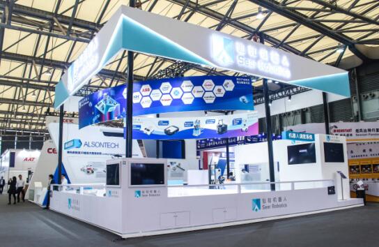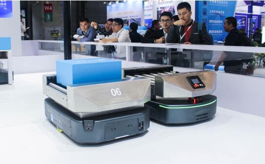 展台上,基于AMB的顶升式搬运机器人,结合 SLAM 算法完成环境地图的构建及高精度的定位,通过 SLAM 导航技术,完成了在指定地点之间进行快速、稳定、精准地搬运。