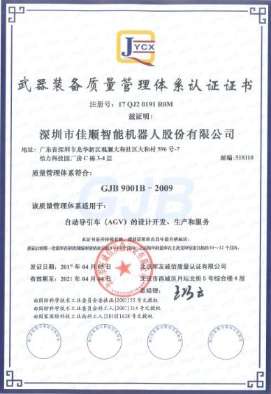 2017年4月,佳顺智能质量管理体系再添新成员,经北京军友认证中心审核组的多阶段现场审核,于本月顺利通过评审,成功获得“武器装备质量管理体系认证”证书,该质量管理体系适用于自动导引车(AGV)的设计开发、生产和服务。同时,该认证是进入军工市场的“通行证”。