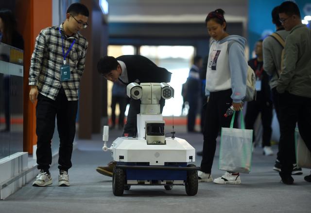 11月10日,人们在展会现场观看展出的一款电力巡检机器人。