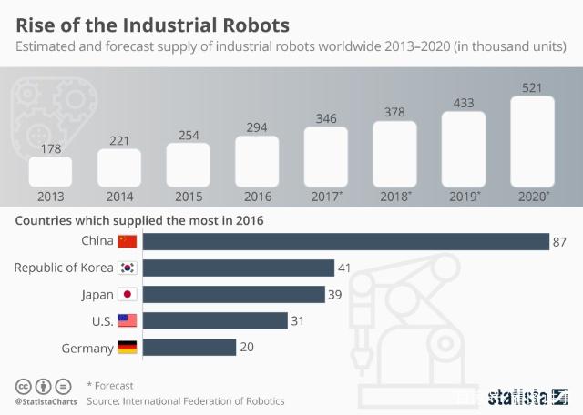 事实上,近几年作为人工智能领域最重要的机器人技术在世界范围内发展迅猛。根据国际机器人联合会的数据,到2020年全球工业机器人数量将达到521,000台,比2016年增加71%。