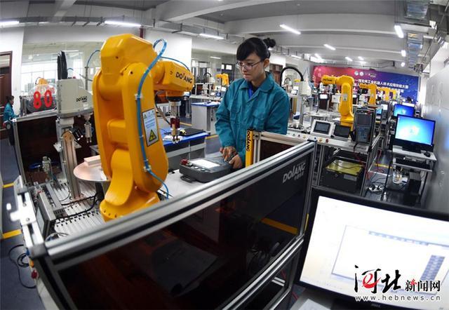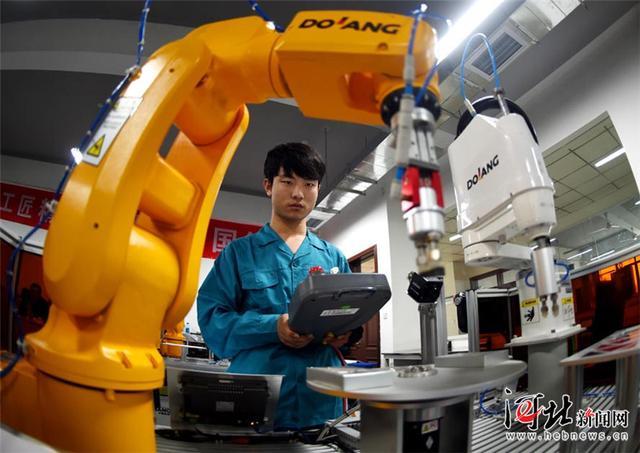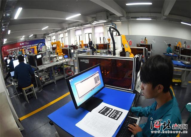 11月15日至18日,2018年中国技能大赛——河北省工业机器人技术应用技能大赛暨第三届全国工业机器人技术应用技能大赛河北省选拔赛,在河北化工医药职业技术学院举行。此次大赛旨在加快培养和选拔工业机器人领域高技能人才,弘扬工匠精神,助力中国智造。共有来自29家单位(院、校)的111名选手分别参加学生组和职工组的比赛。比赛中获得职工组个人成绩前3名的选手,由河北省人力资源和社会保障厅授予“河北省技术能手”荣誉称号;获得学生组个人成绩前5名的选手,由省工业和信息化厅授予“河北省电子信息行业技术能手”荣誉称号。图为11月15日,选手在参加工业机器人技术应用技能大赛。 记者赵永辉摄影报道