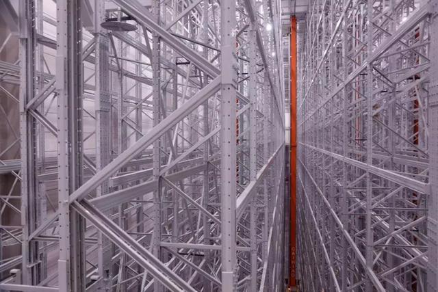 另外,未来园区的仓库是立体仓库,传统仓库货架最高8.1米左右,而未来园区的立体仓库货架高度近30米,有10层楼高,传统仓库货架之间的距离在3米左右,而未来园区立体仓库货架间距只有1.55米,所以,同等面积下,立体仓库存储量是传统仓库的5倍,还用堆垛机自动化操作代替了原本的叉车作业,效率大大提高。