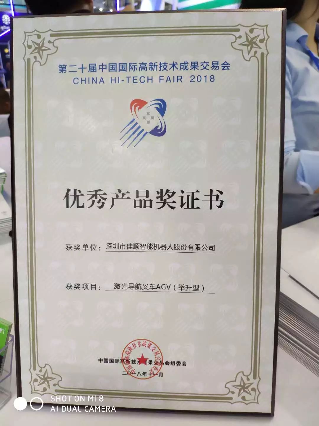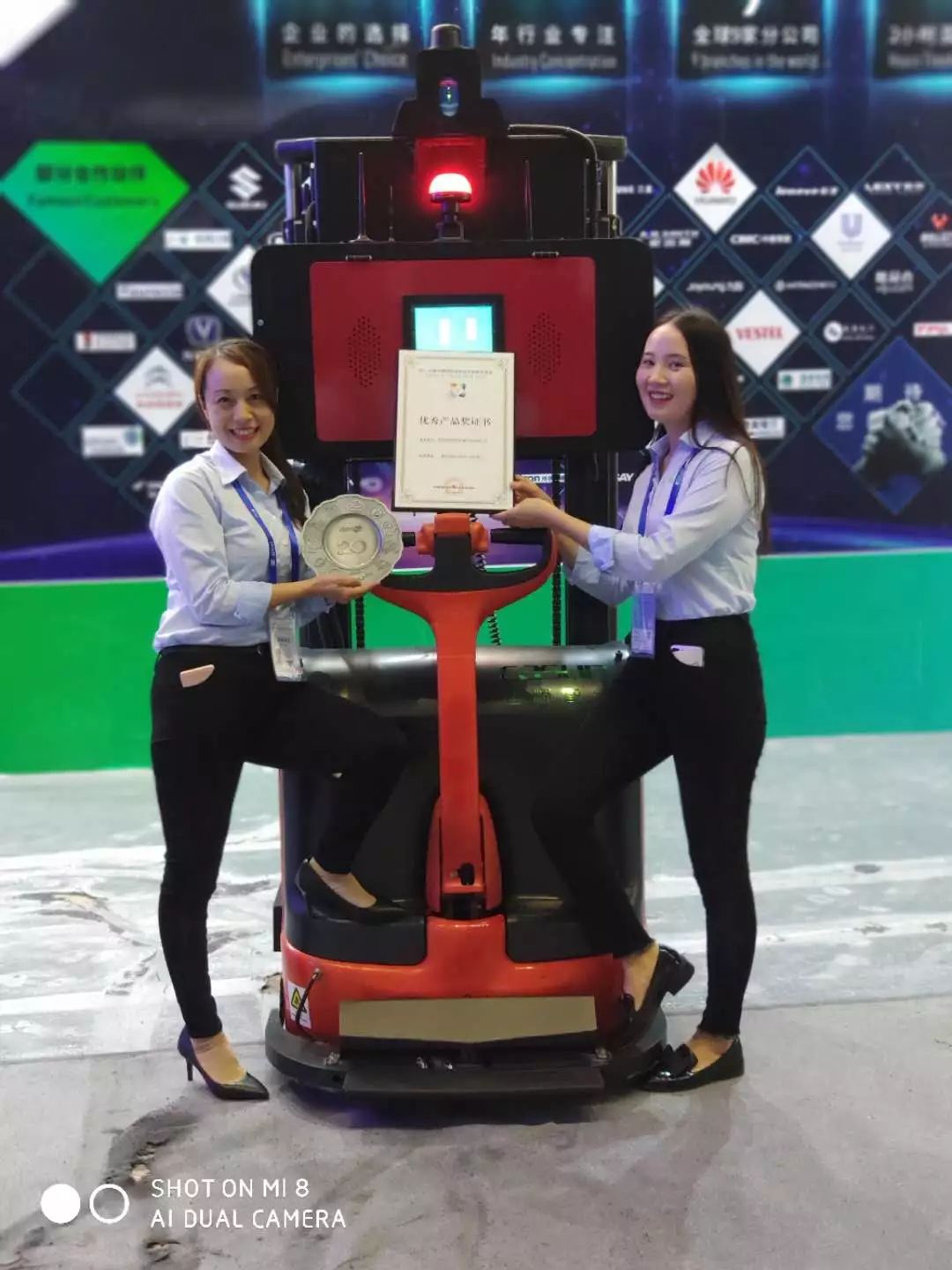 是否感觉上一张图片很奇怪为什么合影会出现了一位特殊“嘉宾”?“他”到底是何方神圣?请允许我隆重介绍一下这位特殊的“嘉宾”“他”就是荣获2018年高交会优秀产品奖的得主:激光导航叉车AGV(ps:“嘉宾”我在3000+多家展商逾万个高新科技产品中脱颖而出,我靠的是实力)