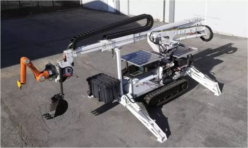 麻省理工学院研发的数字建设机台。这款产品最底部的装置就像装有坦克履带的探测车一样,上面有两只机械手臂,手臂的末端还装有喷嘴。
