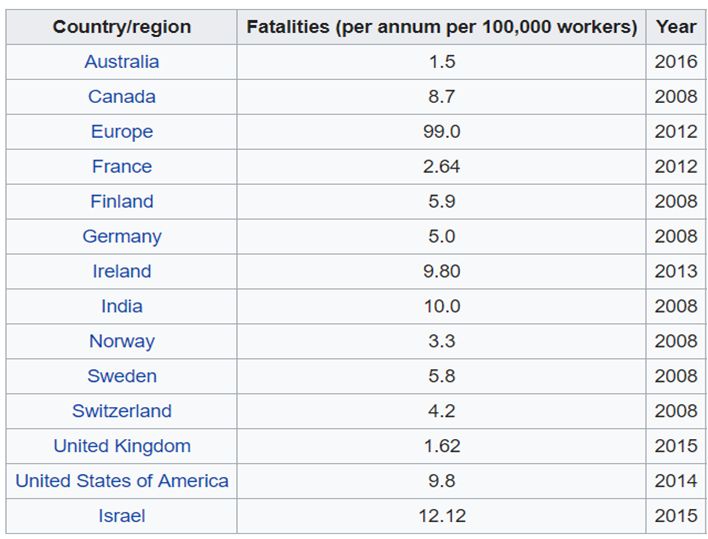 在英国,建筑行业造成了31%的工作死亡和10%的重大工伤。在南非,建筑工地每年造成150人死亡,大约400人受伤。在巴西,所有职业死亡的发生率为每10万人3.6人。