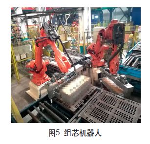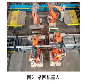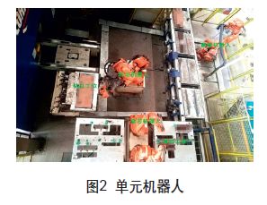 每个制芯单元同时也包括多个流程:钻孔、修芯、组芯以及紧固(工艺流程见图1),通过多个机器人(单元机器人见图2)协调同步完成所有工作流程内容,在机器人高精度的运行下,将各流程联动,保质保量地进行全自动生产。