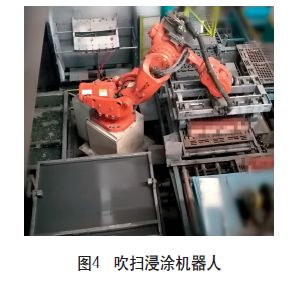 单个单元完成工作后形成多个砂芯的组合,配合轨道的输送,其他单元机器人的联动,逐步形成完整的芯组,整个流程又实现“由零化整”的过程。完整的芯组通过机器人全自动地进行整体的紧固(见图3)、吹扫浸涂(见图4)、组芯(见图5)操作,最终完成整个芯组的自动化生产。