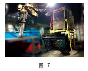 为此,我们在原有一台铸件夹取机械手(见图7)的前提下再次新增机械手,通过人的主动控制原则,操作使机械手模拟人手和臂展动作,代替繁重、环境恶劣的工作,同时还可以根据需要选择是否在机械手夹具上安装气锤装置来代替砸浇冒口的操作,从而实现铸件的流畅转运。
