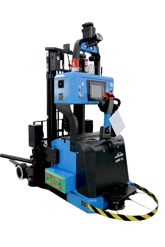 无标识激光前移式叉车AGV,配置可折叠站板及护臂,可以在狭窄的通道内灵活地进行存取作业,用于仓储和生产线上的物料自动搬运堆垛。