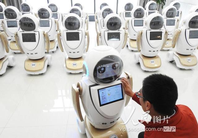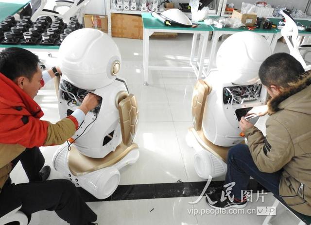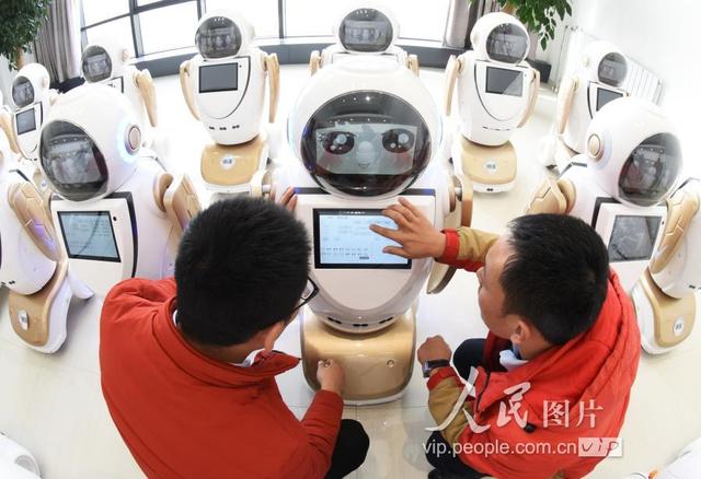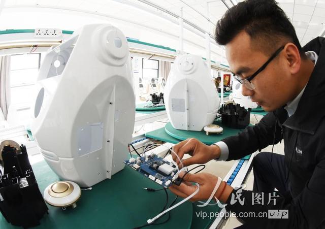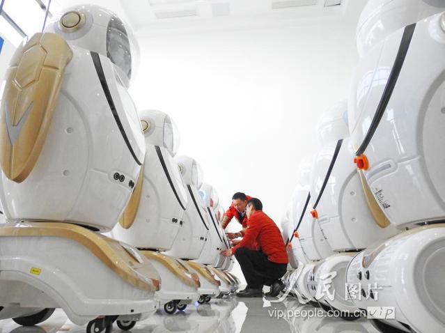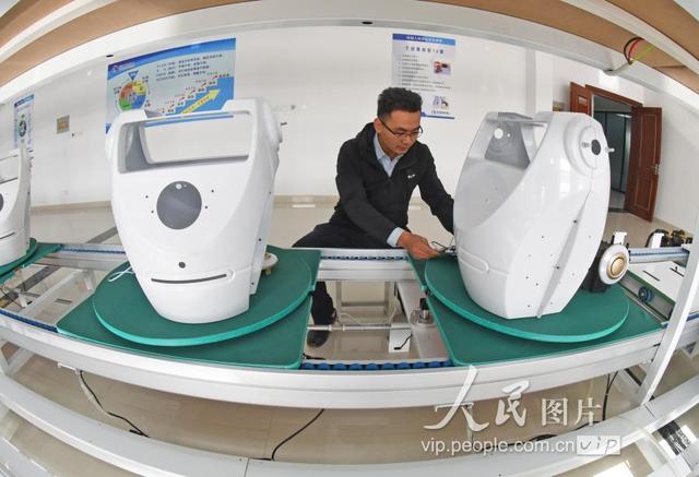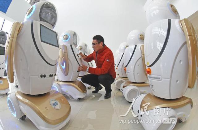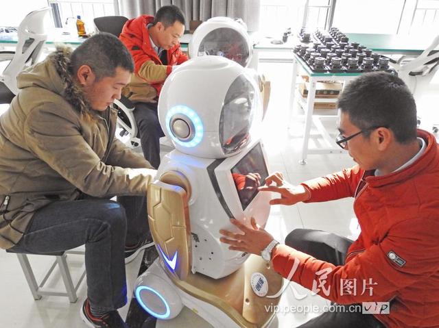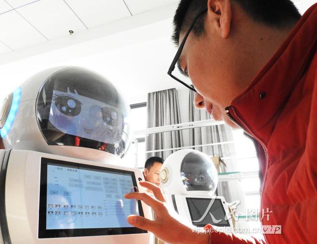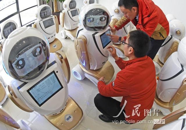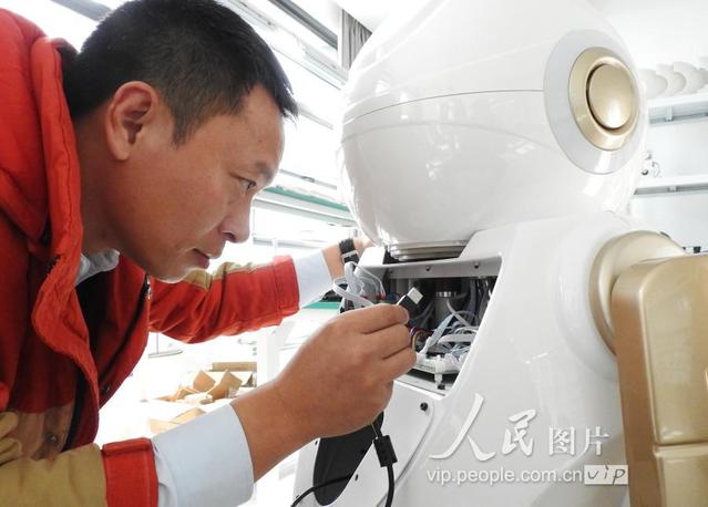 2018年12月4日,连云港市海州经济开发区,技术人员在调试智能商用服务机器人。