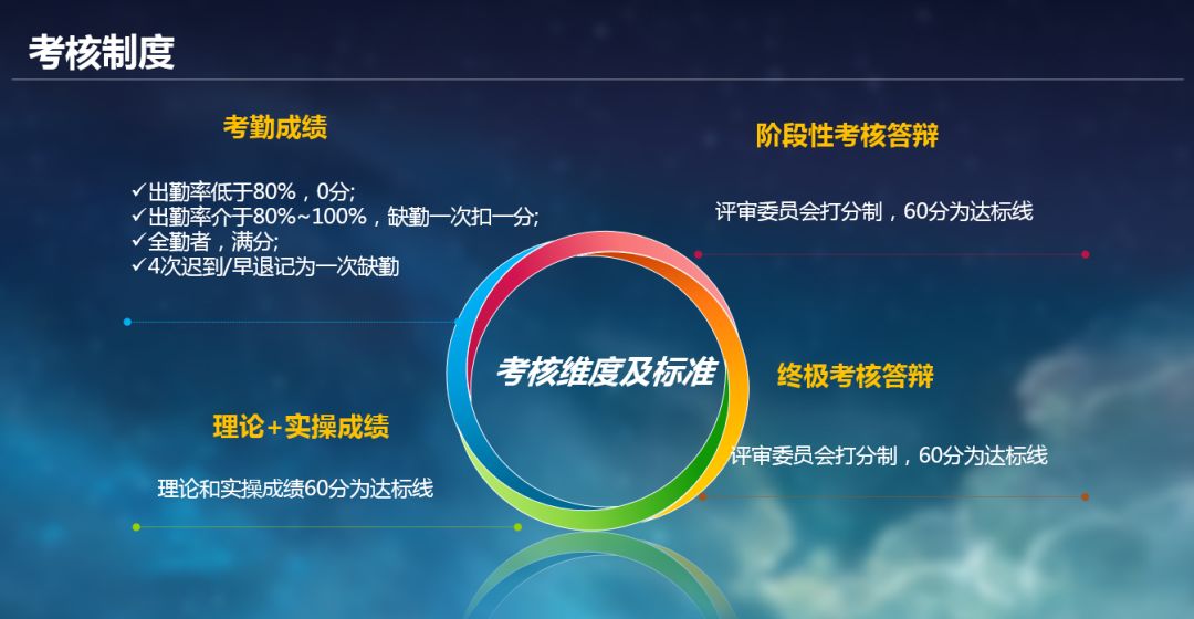 第二,魔鬼式训练,严苛淘汰率。云梯计划的淘汰率极高,无论是课程编排,还是比赛机制都是极其严苛的,学员需要在高强度的学习环境下完成每一次考核和操作,堪称“魔鬼式的训练” 。与此同时,云梯计划的门槛极高。6次考试或答辩成绩不达标即为肄业,不颁发毕业证,综合成绩60分以下,排名后20%-30%的淘汰率,不颁发毕业证。