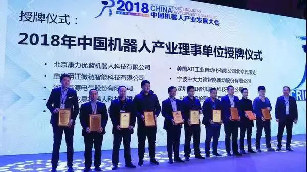 开幕会上还为中国机器人产业联盟新通过的理事长及理事单位举行了授牌仪式,分别为两家新通过的理事长单位以及22家理事单位进行授牌。
