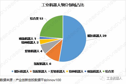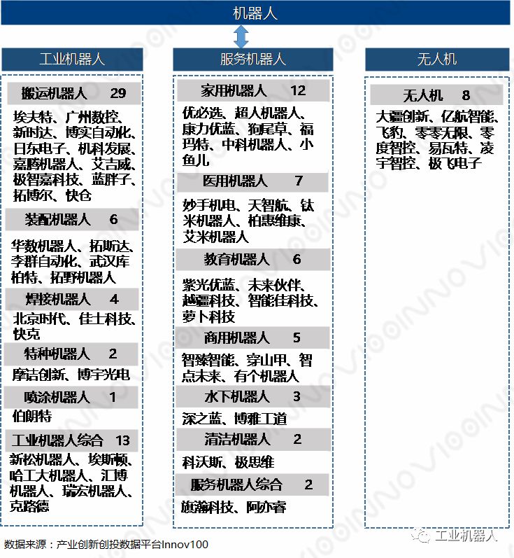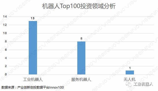 机器人创新Top100中,工业机器人的公司占比最高,达到55家,占比55%,服务机器人37家,无人机为8家紧随其后。