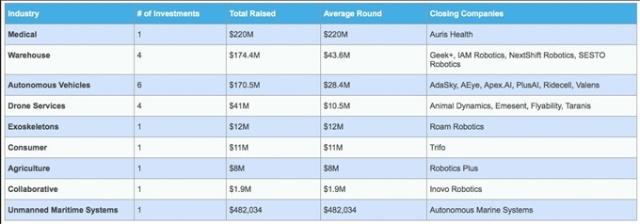 开发自动驾驶汽车硬件和软件的公司共获得六项投资,总额达1.705亿美元,而仓库机器人公司(共筹集1.744亿美元)和无人机服务提供商(共筹集4100万美元)各获得四项投资。