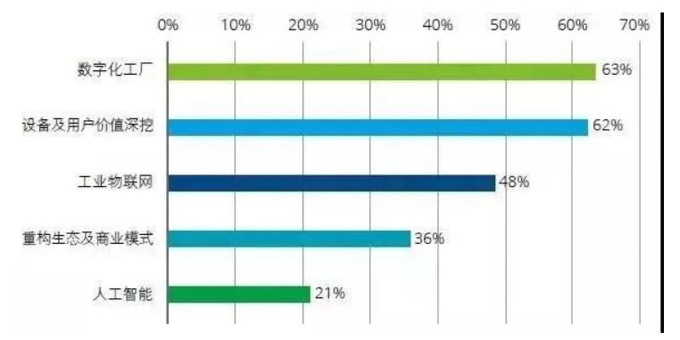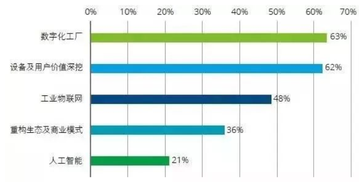 中国工业企业智能制造五大部署重点,依次为:数字化工厂(63%)、设备及用户价值深挖(62%)、工业物联网(48%)、重构商业模式(36%)以及人工智能(21%)。(见图1)
