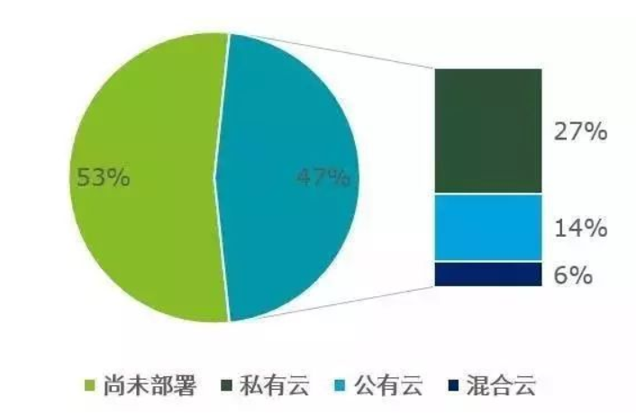 中国制造企业云部署积极性不高。53%的受访制造企业尚未部署工业云,47%的企业正在进行工业云部署,其中27%的企业部署私有云,14%部署公有云,6%部署混合云。(见图2)